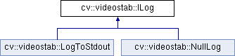 Implemented in cv::videostab::LogToStdout, and cv::videostab::NullLog.
